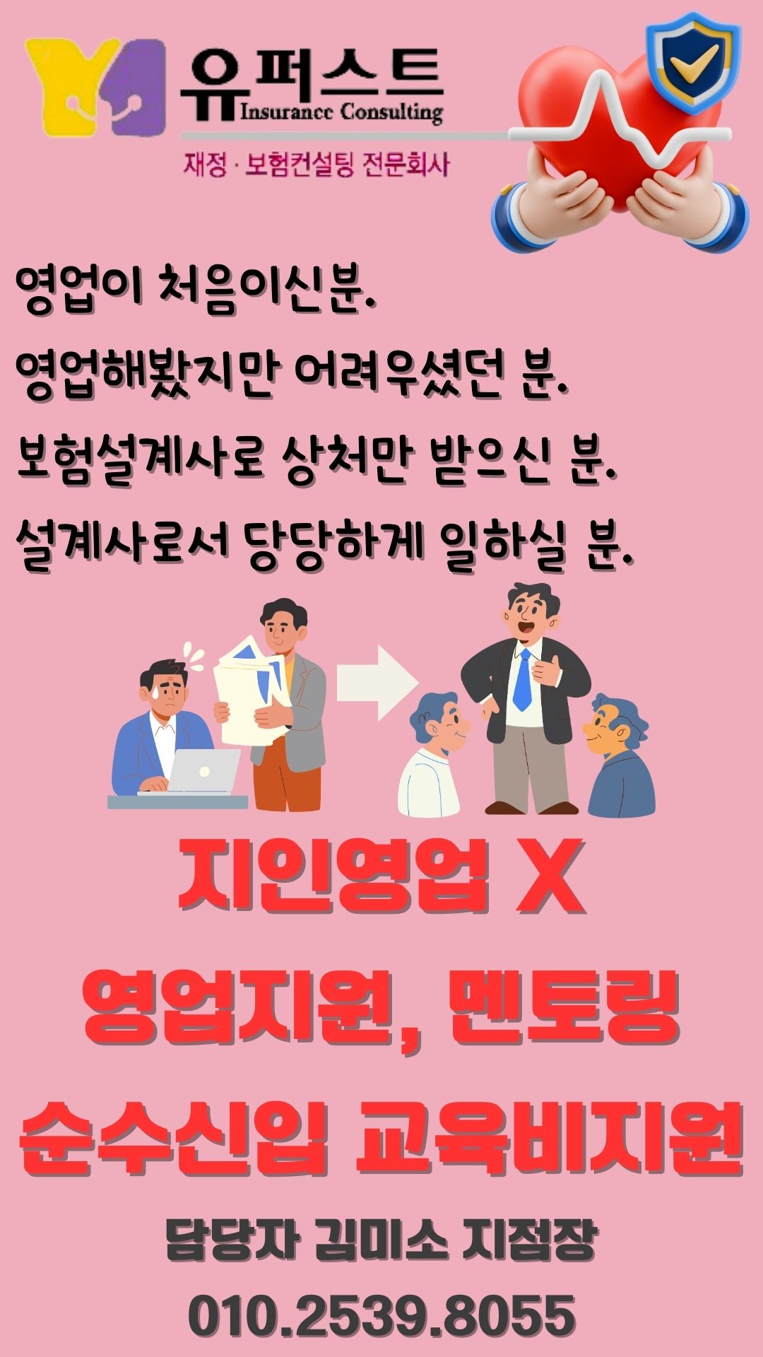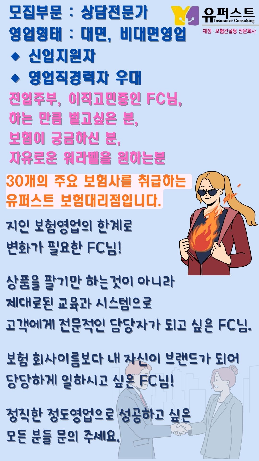 유퍼스트 보험마케팅 주소: 부산 동래구 충렬대로 79 목록 유퍼스트보험마케팅 미남지사에서 함께하실분 모집합니다. 등록일: 2026.03.03 조회수: 0회 상시 모집조건 회사분류 GA 근무지역 부산/울산/경남 경력요구사항 신입 (업계 경험 無) 채용공고 내용 고용형태 : 위촉직(프리랜서) 모집인원 : ○명 (10명 미만) 근무기간 : 1년이상 근무요일 : 주5일근무시간 : 09:30~16:30 복리후생 : 산재보험, 성과급, 경조금, 건강검진, 연차, 월차, 정기휴가, 포상휴가, 휴게시간 지원신청을 하려면 로그인이 필요합니다 로그인하기