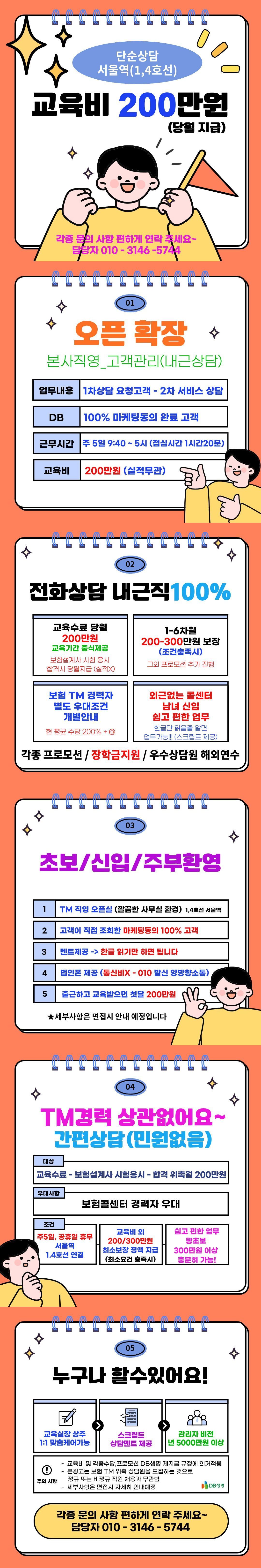 DB생명보험(주) 주소: 서울 용산구 후암로 107 목록 [교육비 당월지급]서울역1.4호선/내근/단순상담/고객 관리 TM/신입/서비스 등록일: 2026.04.14 조회수: 8회 상시 모집조건 회사분류 GA 근무지역 서울/경기/인천 경력요구사항 신입 (업계 경험 無) 채용공고 내용 지원신청을 하려면 로그인이 필요합니다 로그인하기