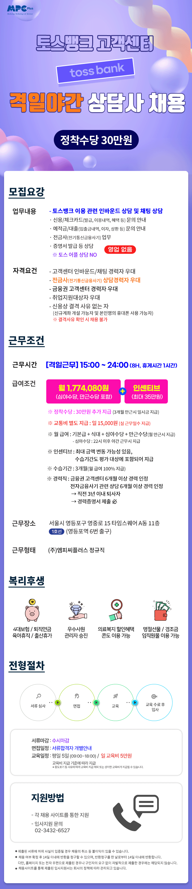 [야간/격일근무] 토스뱅크 간단안내 인바운드/채팅 상담사CS 채용 T1
