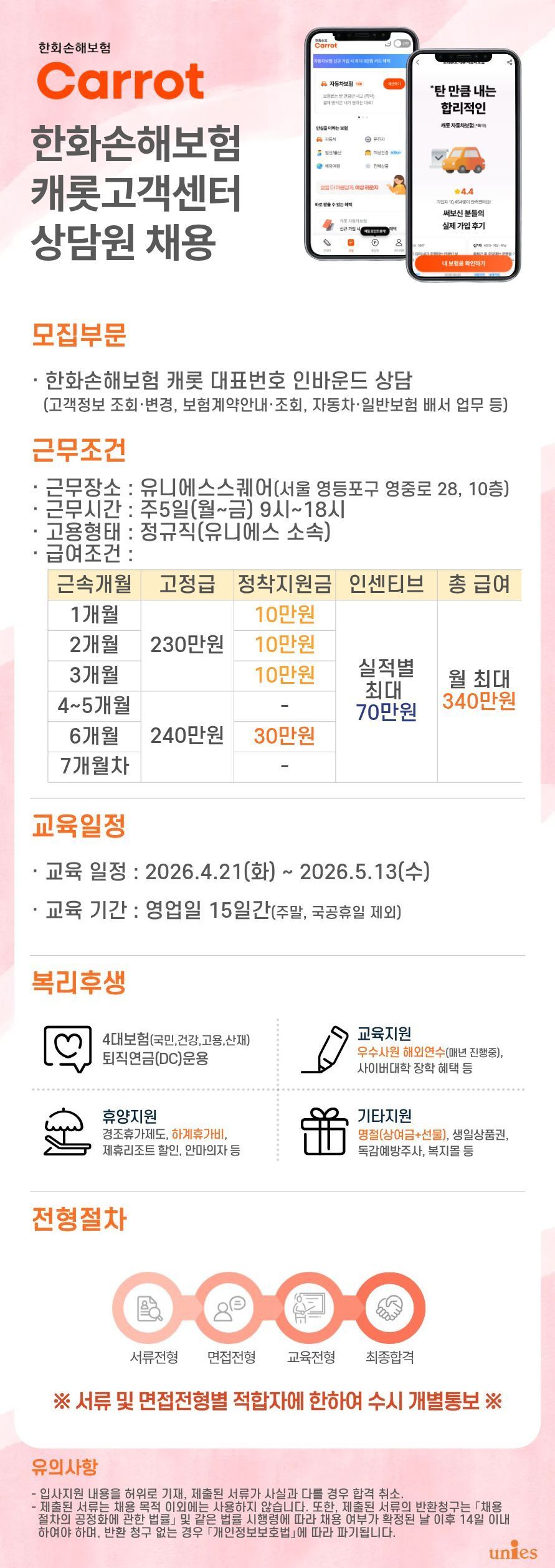 유니에스 주소: 서울 영등포구 영중로 28 목록 [정착금60만/영업X/영등포역]한화손해보험 캐롯 인바운드 상담원 채용 등록일: 2026.04.14 조회수: 10회 상시 모집조건 회사분류 GA 근무지역 서울/경기/인천 경력요구사항 신입 (업계 경험 無) 채용공고 내용 지원신청을 하려면 로그인이 필요합니다 로그인하기