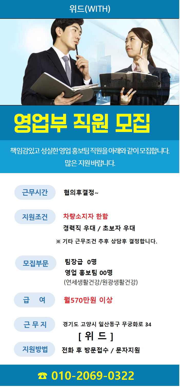 영업부 직원 팀장급 및 영업 홍보팀 모집 (연세생활건강/원광생활건강)
