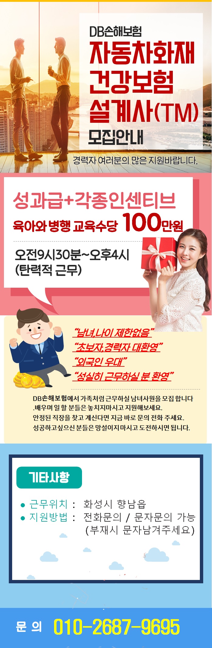 디비손해보험-화성 설계사(TM) 고객관리 및 DB제공/탄력적근무/한국어 유창한 외국인 환영