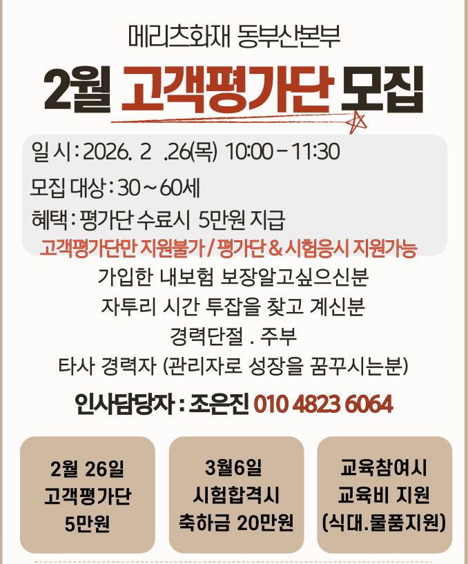 메리츠화재해상보험(주) 주소: 경기 수원시 팔달구 중부대로206번길 4 목록 1일(5만원)-2월26일(목) 메리츠화재 고객평가단 등록일: 2026.02.23 조회수: 12회 상시 모집조건 회사분류 GA 근무지역 부산/울산/경남 경력요구사항 신입 (업계 경험 無) 채용공고 내용 2026년 2월 26일 (목)오전 10:00 ~ 11:30 (2시간-하루)(선착순 5명 / 참석비 5만원) 지원신청을 하려면 로그인이 필요합니다 로그인하기