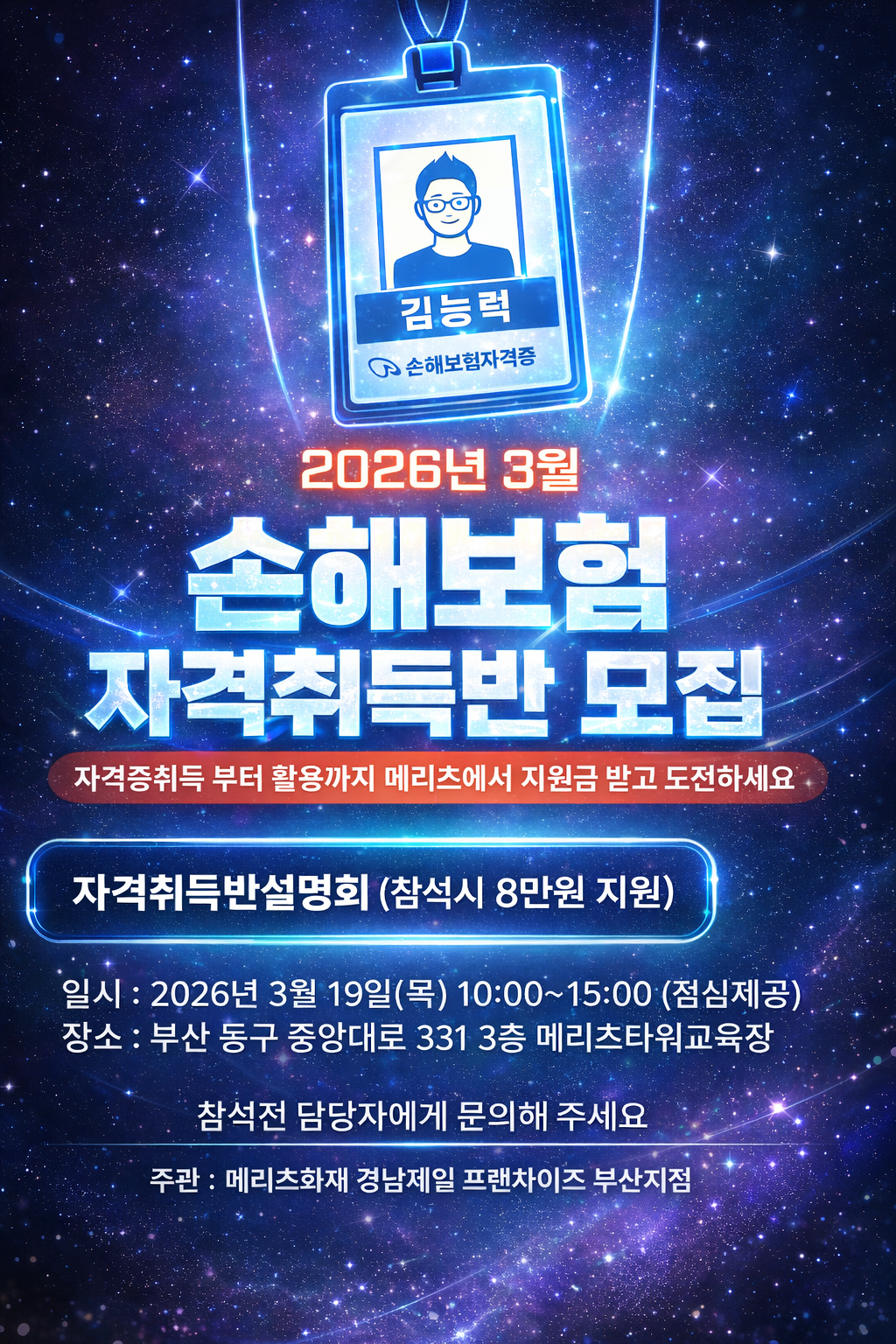 메리츠화재해상보험주식회사 주소: 부산 동구 중앙대로 331 목록 참석시 8만원 지급 메리츠 단기 설명회 모집중/지원총액268만원-선착순5명 등록일: 2026.03.17 조회수: 11회 상시 모집조건 회사분류 GA 근무지역 부산/울산/경남 경력요구사항 신입 (업계 경험 無) 채용공고 내용 지원신청을 하려면 로그인이 필요합니다 로그인하기