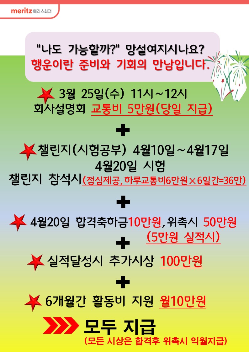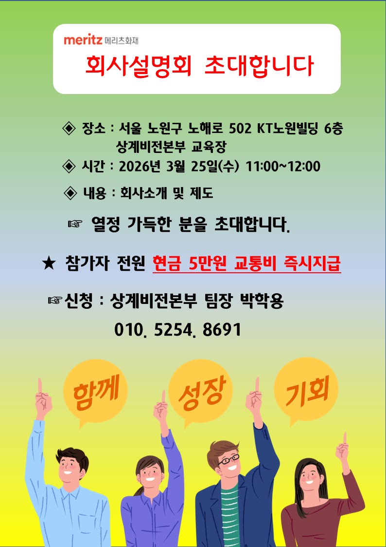메리츠화재해상보험 주식회사 주소: 경남 김해시 내외중앙로 89 목록 회사설명회3월25일/교통비5만/합격60만/위촉시100만/6개월활동비.월10만 등록일: 2026.03.21 조회수: 11회 상시 모집조건 회사분류 GA 근무지역 서울/경기/인천 경력요구사항 1~3년 보험 영업 경험 채용공고 내용 지원신청을 하려면 로그인이 필요합니다 로그인하기