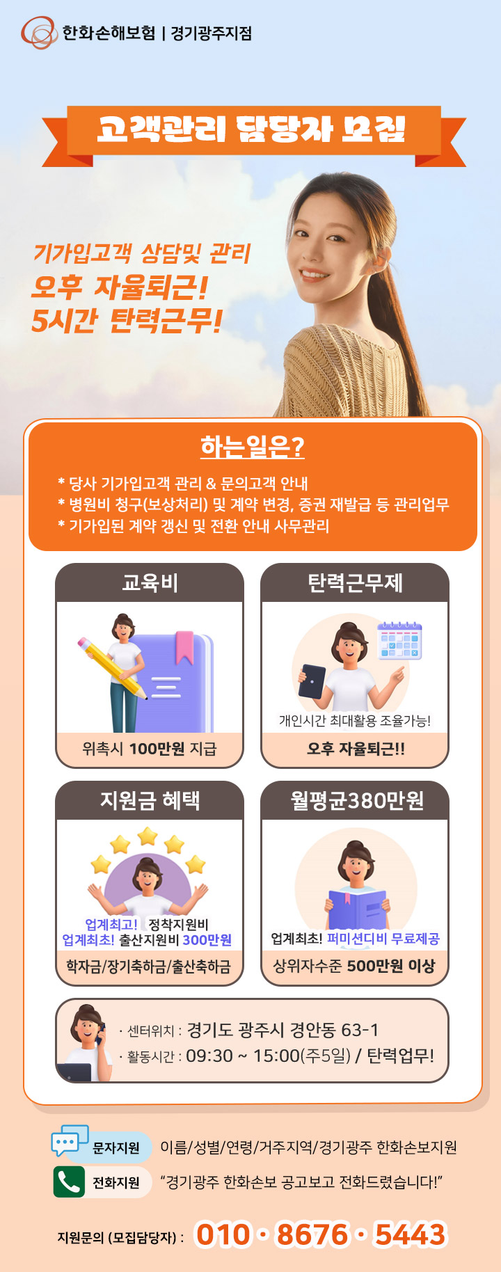 경기광주 한화손보 지점 주소: 경기 광주시 중앙로 136 목록 [평균270만] 남,여 반일 근무자 모집/간단한 상담/요청건 처리 등록일: 2026.03.29 조회수: 10회 상시 모집조건 회사분류 GA 근무지역 서울/경기/인천 경력요구사항 신입 (업계 경험 無) 채용공고 내용 지원신청을 하려면 로그인이 필요합니다 로그인하기