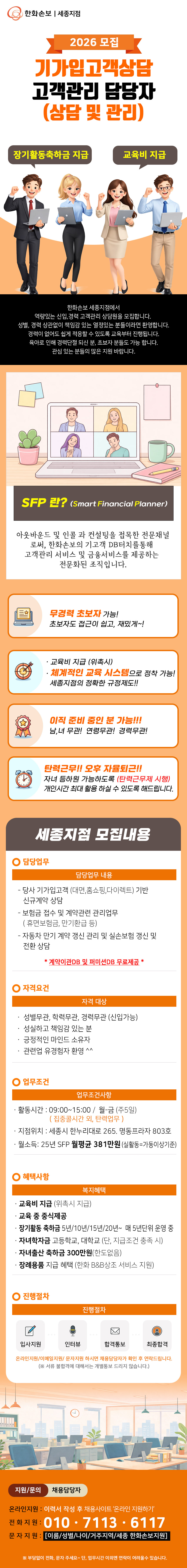 [세종지점]한화손보 주소: 세종특별자치시 한누리대로 265 목록 [지점 파트타임 상담원 모집] 남,여,주부,초보가능/고객확인, 요청건처리 등록일: 2026.04.01 조회수: 10회 상시 모집조건 회사분류 GA 근무지역 대전/충청 경력요구사항 신입 (업계 경험 無) 채용공고 내용 지원신청을 하려면 로그인이 필요합니다 로그인하기