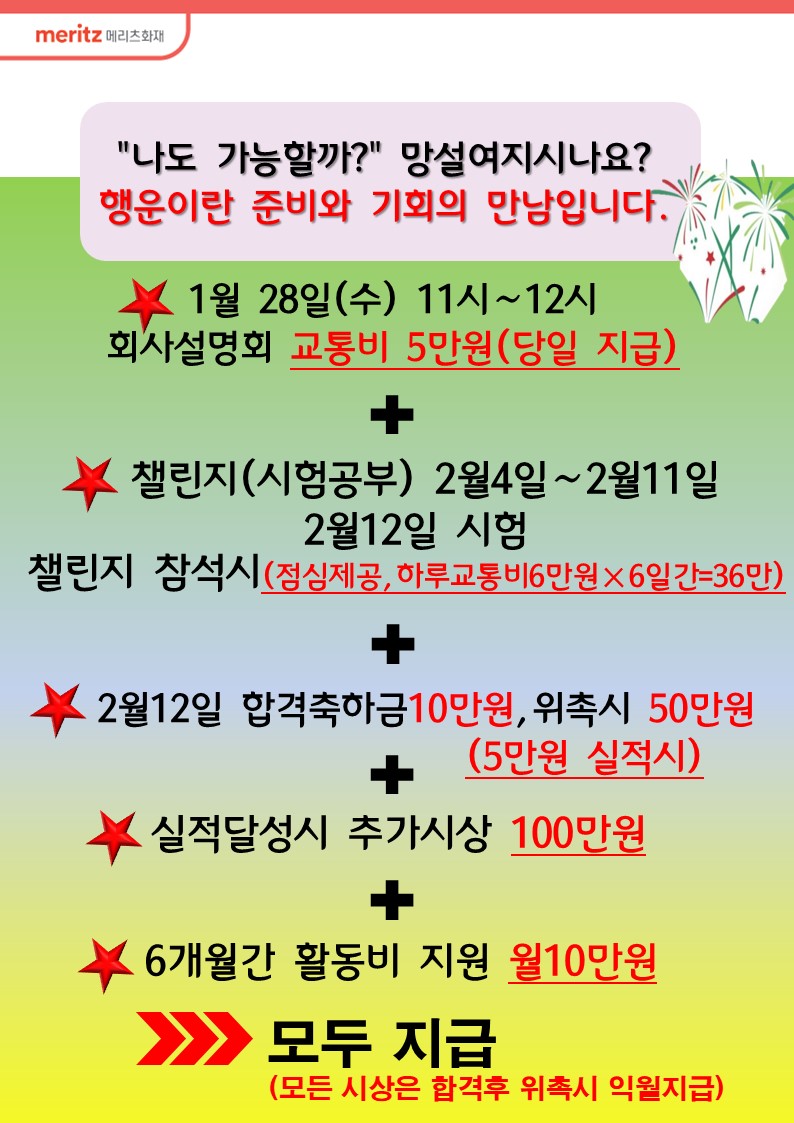 메리츠화재해상보험 주식회사 주소: 경남 김해시 내외중앙로 89 목록 회사설명회1월28일/교통비5만/합격60만/위촉시100만/6개월활동비.월10만 등록일: 2026.01.26 조회수: 7회 상시 모집조건 회사분류 GA 근무지역 서울/경기/인천 경력요구사항 1~3년 보험 영업 경험 채용공고 내용 지원신청을 하려면 로그인이 필요합니다 로그인하기