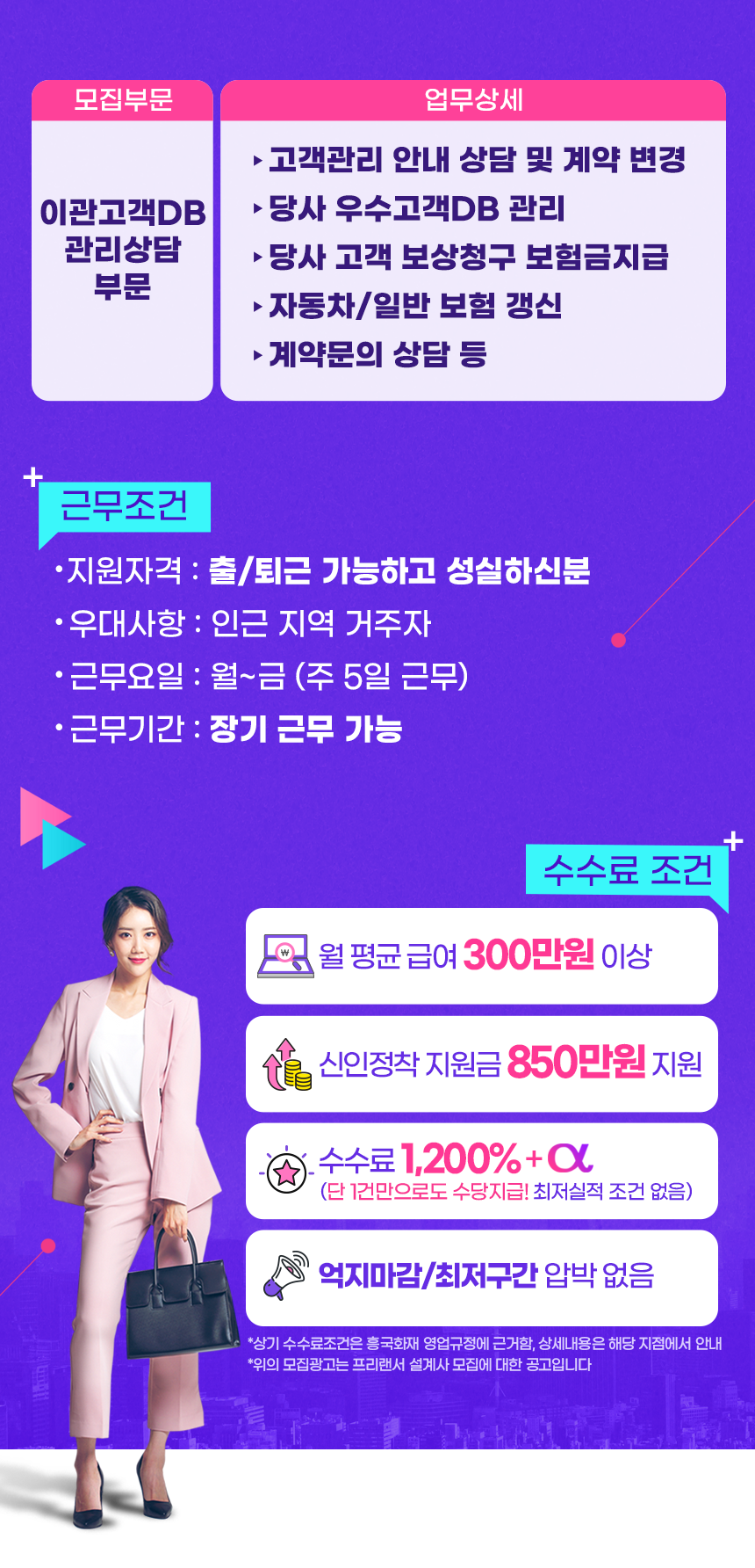 | 업무내용 | 이관고객 DB 고객 상담 및 보험 관리 |