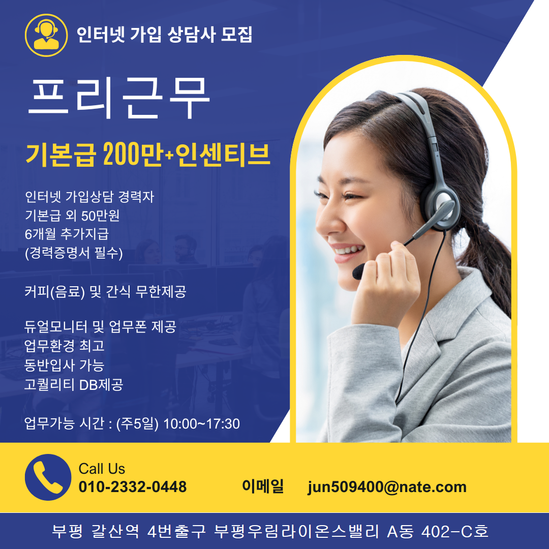 인터넷가입센터 주소: 인천 부평구 부평대로 283 목록 [갈산역1분] 인터넷가입상담 (동종업계최고대우) 경력수당지급/고퀄리티DB 등록일: 2026.02.03 조회수: 6회 상시 모집조건 회사분류 GA 근무지역 서울/경기/인천 경력요구사항 신입 (업계 경험 無) 채용공고 내용 지원신청을 하려면 로그인이 필요합니다 로그인하기