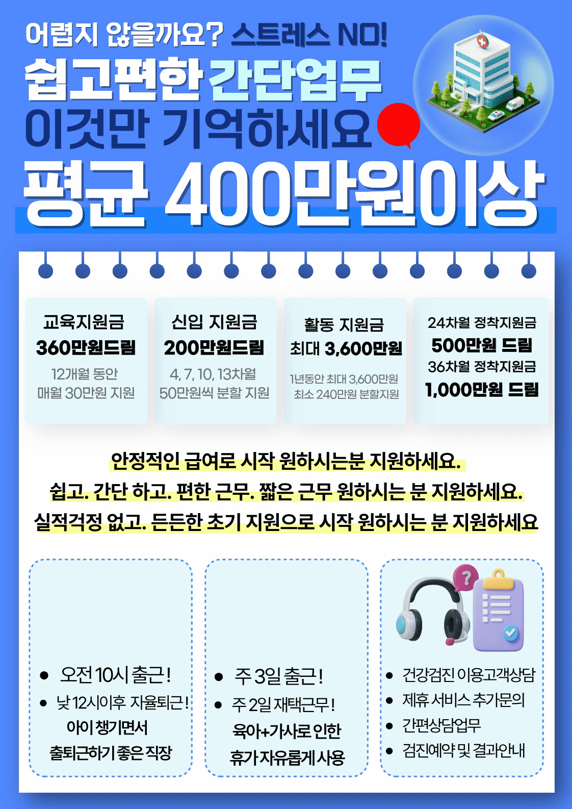 피플라이프 파트너 주소: 대구 수성구 동대구로 387 목록 [육아엄빠클릭]400만원이상[건강검진예약상담]10시~12시/3일출근/2일재택 등록일: 2026.02.11 조회수: 0회 상시 모집조건 회사분류 GA 근무지역 대구/경북 경력요구사항 신입 (업계 경험 無) 채용공고 내용 지원신청을 하려면 로그인이 필요합니다 로그인하기