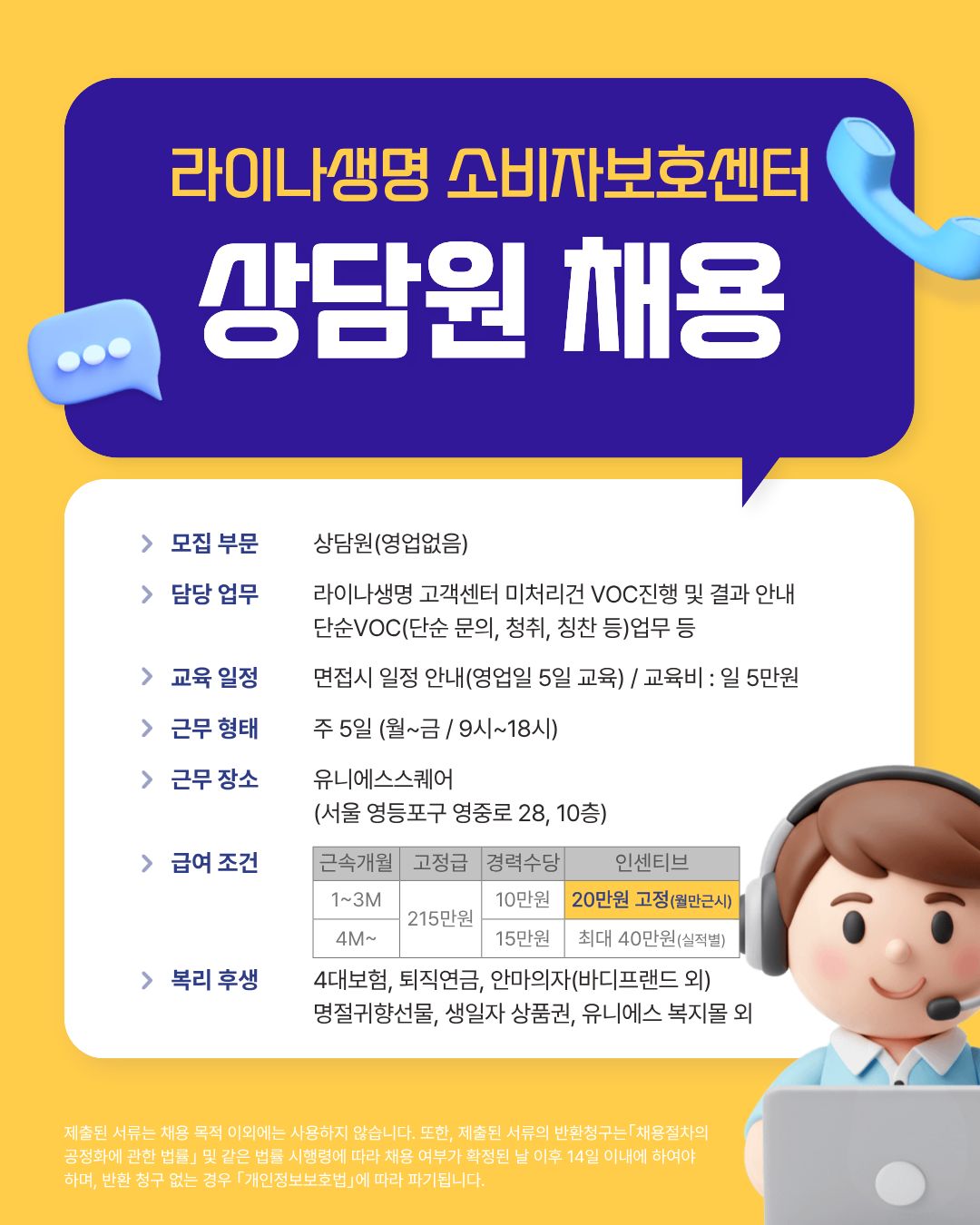 유니에스 주소: 서울 영등포구 영중로 28 목록 [영업없음,5일교육]라이나생명 소비자보호센터 상담원 채용 등록일: 2026.01.20 조회수: 7회 상시 모집조건 회사분류 GA 근무지역 서울/경기/인천 경력요구사항 신입 (업계 경험 無) 채용공고 내용 지원신청을 하려면 로그인이 필요합니다 로그인하기