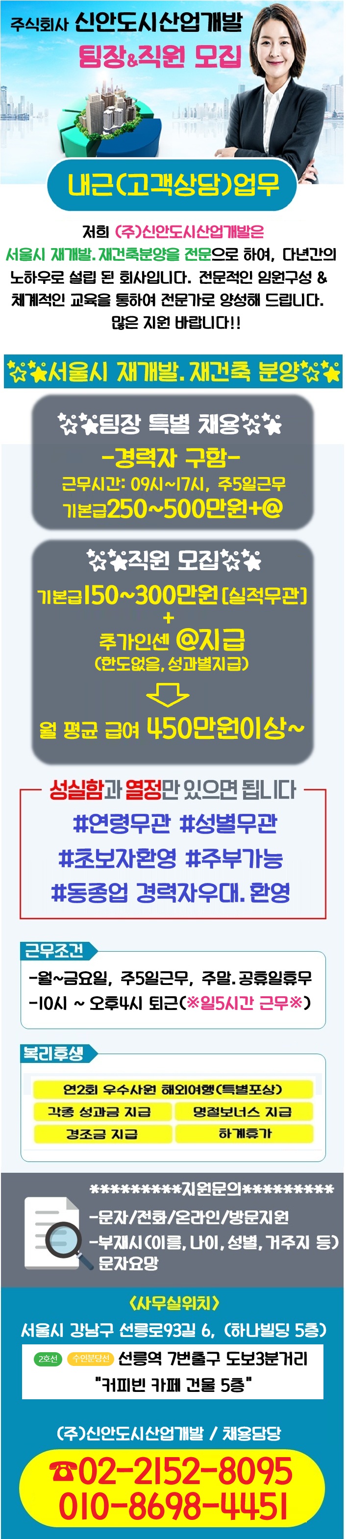 주식회사 신안도시산업개발 주소: 서울 강남구 선릉로93길 6 목록 내근고객상담업무/팀장&직원/월평균450만이상/주5일/일5시간/시간대비높은급여 등록일: 2026.04.08 조회수: 5회 상시 모집조건 회사분류 GA 근무지역 서울/경기/인천 경력요구사항 신입 (업계 경험 無) 채용공고 내용 지원신청을 하려면 로그인이 필요합니다 로그인하기