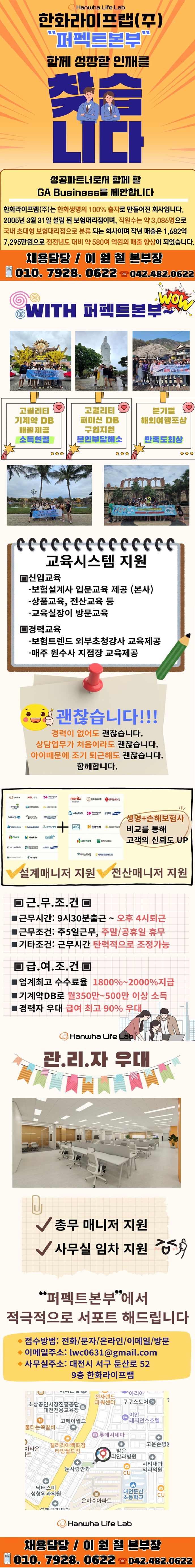 한화라이프랩 주식회사(퍼펙트본부) 주소: 대전 서구 둔산로 52 목록 4시퇴근/기계약DB로 월350~500/DB무료/초보육아병행/경력급여90%우대 등록일: 2026.01.21 조회수: 10회 상시 모집조건 회사분류 GA 근무지역 대전/충청 경력요구사항 신입 (업계 경험 無) 채용공고 내용 지원신청을 하려면 로그인이 필요합니다 로그인하기